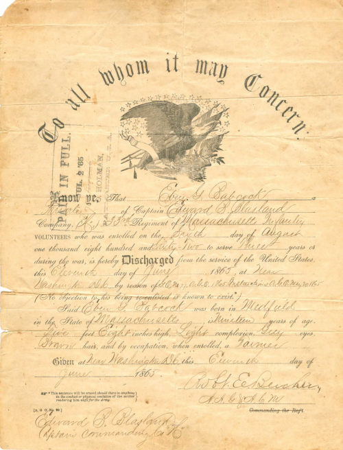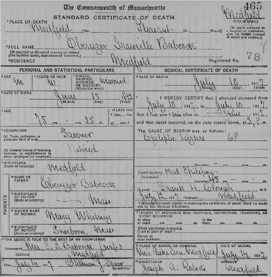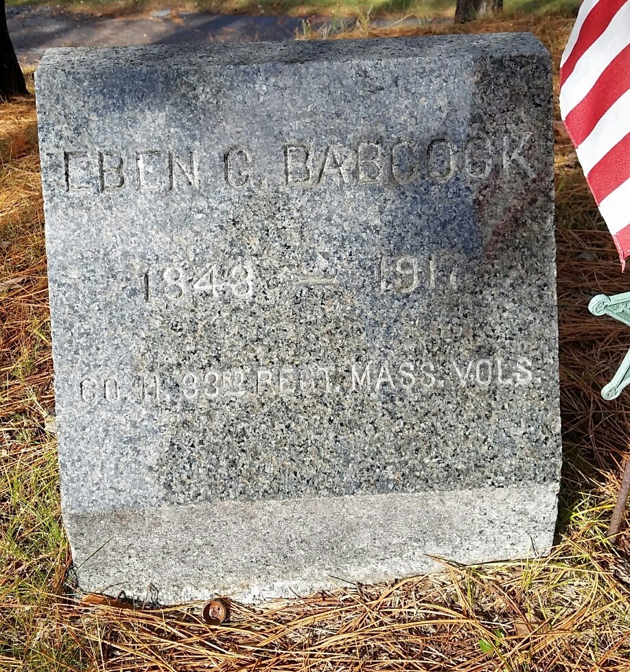 Eben Granville Babcock was honorably discharged on June 11, 1865. He went home to his beloved Medfield, where he returned to farming and remained for the rest of his life. We assume he worked the farm with his father, and took it over some time before the latter’s death in 1876. We know he joined the Moses Ellis Post G.A.R., and by all accounts, lived a quiet and peaceful life. In 1867 Eben married Clara A. Morse of Norfolk. The Babcocks had a son and daughter, George W. Babcock and Mrs. William C. McLeod (Anna). Eben died of epilepsy in 1917 (Incidentally, the death certificate was signed by Stillman J. Spear, the subject of a previous Portal story.)