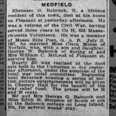 The Dedham Transcript, in the spring of 1935, reported that “Mrs. Clara Babcock, a Civil War widow, is seriously ill at her home on West Main Street.” On April 16 of that year, that newspaper reported on funeral services for Clara, conducted at her home: “Interment was in the family lot in Vine Lake cemetery. Mrs. Babcock, daughter of Jotham and Lydia (Whitney) Morse . . . is survived by two children, George W. Babcock and Mrs. William C. McLeod, four grandchildren and five great-grandchildren. She had been a resident of this town upwards of 66 years and an active member of Medfield Grange as long as her health would permit, and of Moses Ellis Women’s Relief Corps.”