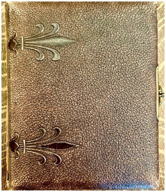 These days, “the cloud” holds our photographs, possibly forever. And for those of us still blessed or burdened with physical photos cluttering our physical spaces, there are apps that can scan and send them there. I sometimes imagine the amazement of our Medfield forbears if they could see this innovation, but they only stare back at me from their photos. One of our treasures is a massive photo album, bound in leather, with large brass hinges and a clasp on the side, which was once owned by William Smith Tilden (1830-1912) and his wife. Tilden was the first president of Medfield History Society and author of our “Bible,” The History of Medfield from 1650-1886. The album was designed to hold Cabinet Cards, which “were America’s main format for photographic portraiture throughout the last quarter of the nineteenth century. . .  Inexpensive and sold by the dozen, they transformed getting one’s portrait made from a formal event taken up once or twice in a lifetime to a commonplace practice shared with friends (Pauwels).” These popular photographs, introduced in the 1870s, were albumen prints glued to cards standardized to 6 ½ by 4 ½ inches. This size was large enough to reveal extensive detail. People often incorporated elaborate or fancy backdrops, poses and props (Pauwels). The phenomenon spawned the manufacturing of special albums, which were often quite elaborate (see Figure 1).