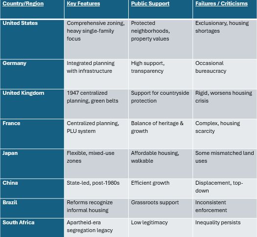 Overall, zoning succeeds where it is flexible, inclusive, and tied to widely valued goals such as health and environmental protection (e.g., Germany, Japan). It fails where it entrenches inequality, affordability crises, or rigid controls (e.g., U.S., UK, South Africa). These lessons remain crucial for cities facing housing pressures, climate change, and growth in the 21st century.